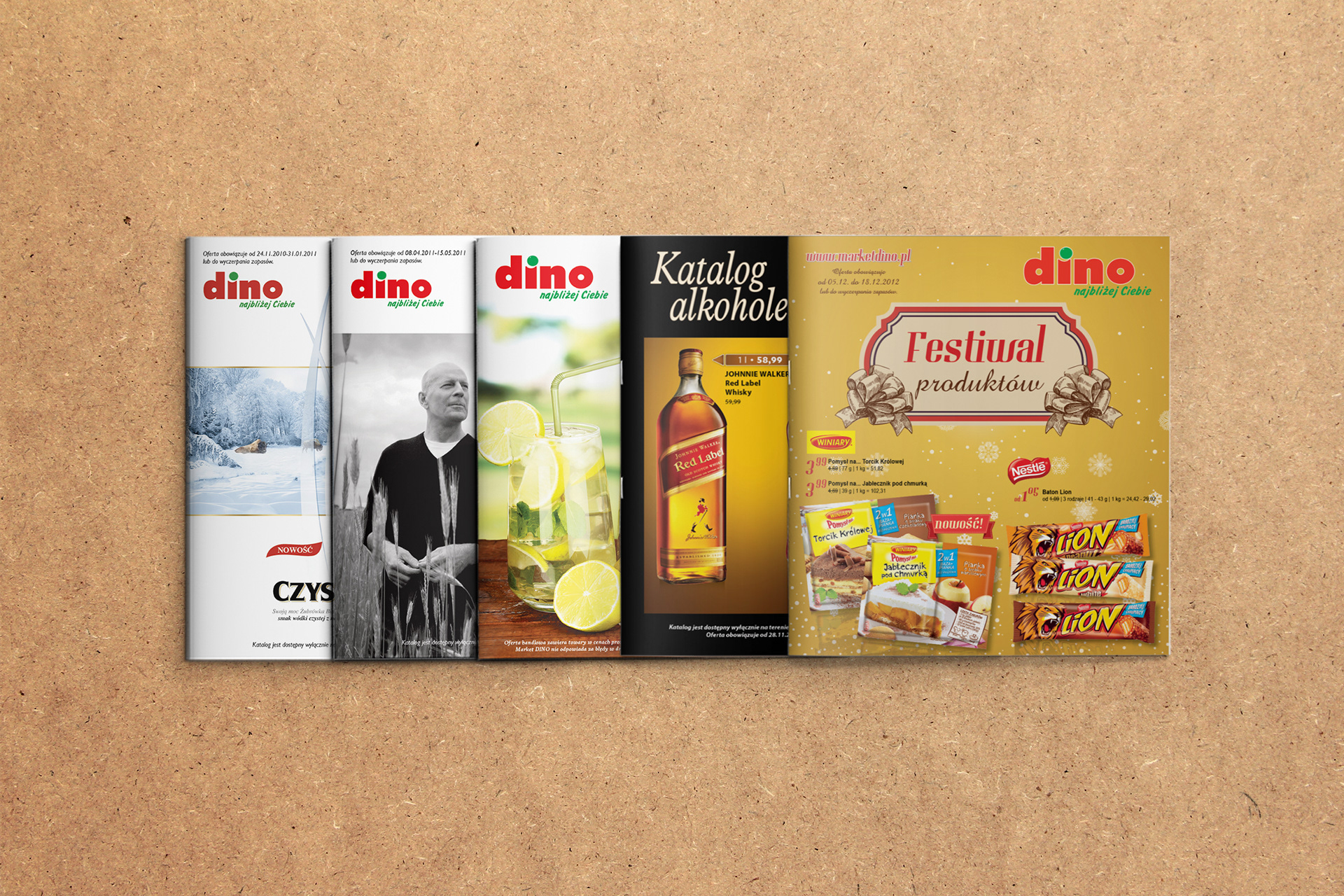 Dla polskiej sieci handlowej DINO projektowaliśmy gazetki, katalogi alkoholowe i produktowe w latach 2010-2013.